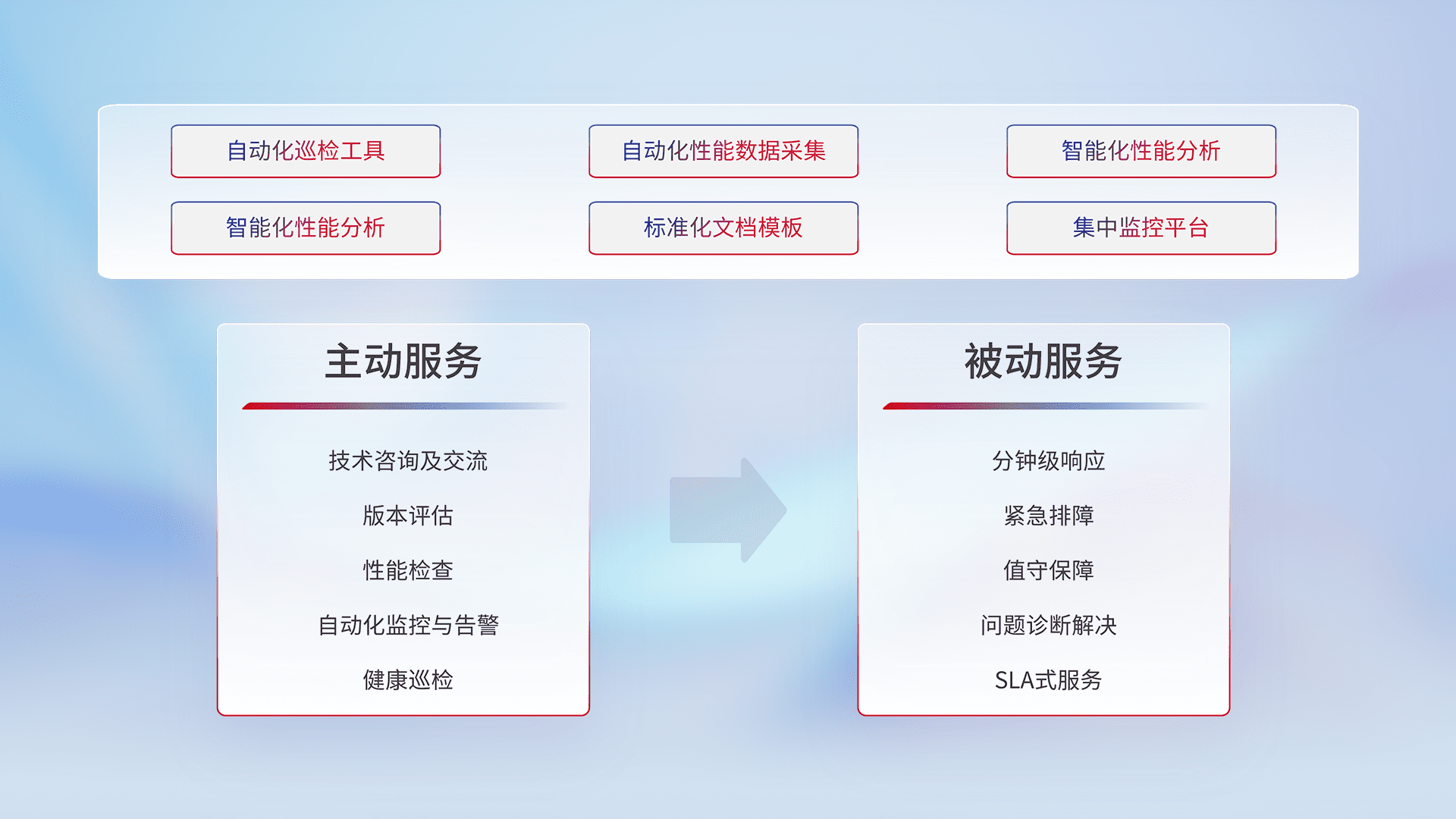智能化工具和标准化文档,,,,保障服务质量,,提供主动服务(包含技术咨询、、、、版本评估、、性能检查、、自动化监控与告警、、、、健康巡检)和被动服务包含(分钟级响应、、、紧急排障、、、值守保障、、、、问题诊断解决、、、SLA服务)。。。