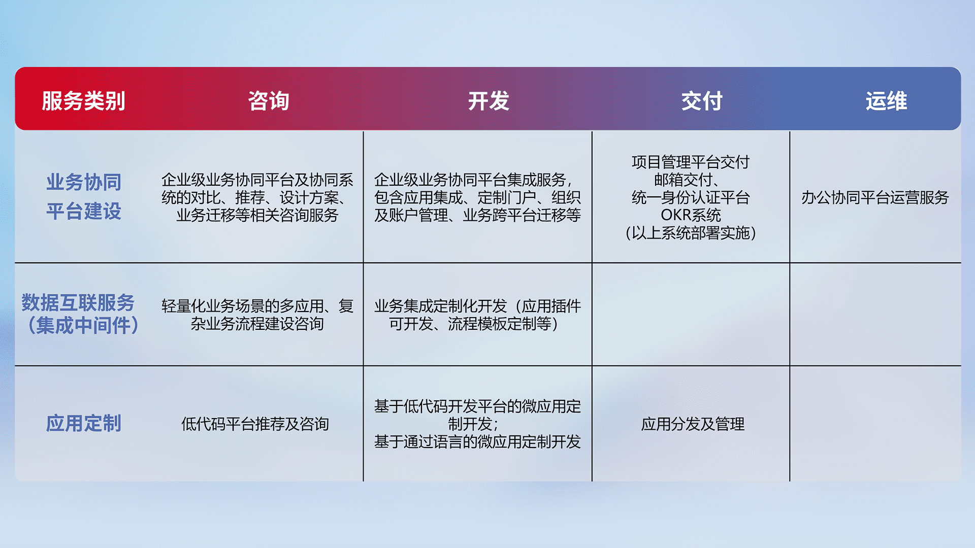 针对钉钉、、企微、、IDaas等平台级产品提供产品的规划、、、、方案、、、、交付、、、定制化开发等服务,,,,实现如统一协同办公、、智能客户服务、、混合会议管理、、智能数据查询、、等业务场景,,,,实现数字化转型。。。。